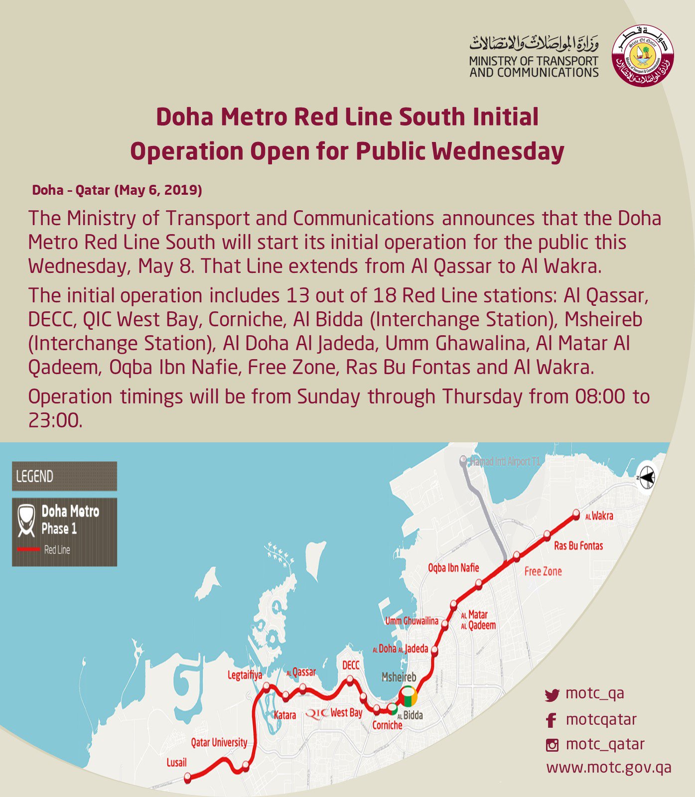दोहा मेट्रो अन्तर्गत रेड लाइन दक्षिण तर्फको प्रारम्भिक सेवा यो मे ८ तारिक बुधबार सर्वसाधारणका लागि खुला गरिने यातायात तथा संचार मन्त्रालयले बताएको छ । यो मार्ग अल कासर देखि अल वक्रा सम्म पर्दछ ।